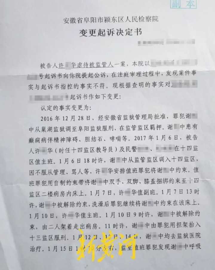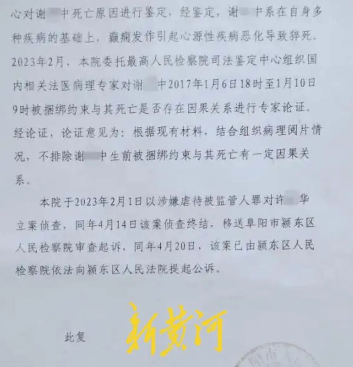 回报函中还称,该院委用最高手民稽察院司法刚烈中心组织国内关系法医病理群众对谢某中2017年1月6日18时至1月10日9时被绑缚拘谨与其死一火是否存在因果关系进行群众论证。论证见地为:根据现存材料,皆集组织病理阅片情况,不排斥谢某中生前被绑缚拘谨与其死一火有一定因果关系。随后,阜阳市颍东区东说念主民稽察院对许某华拿起了公诉。