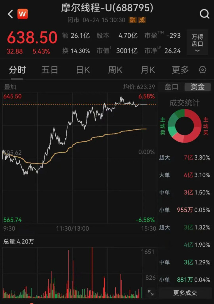 抛弃24日收盘,摩尔线程涨5.43%,每股报638.5元,市值3001亿元。