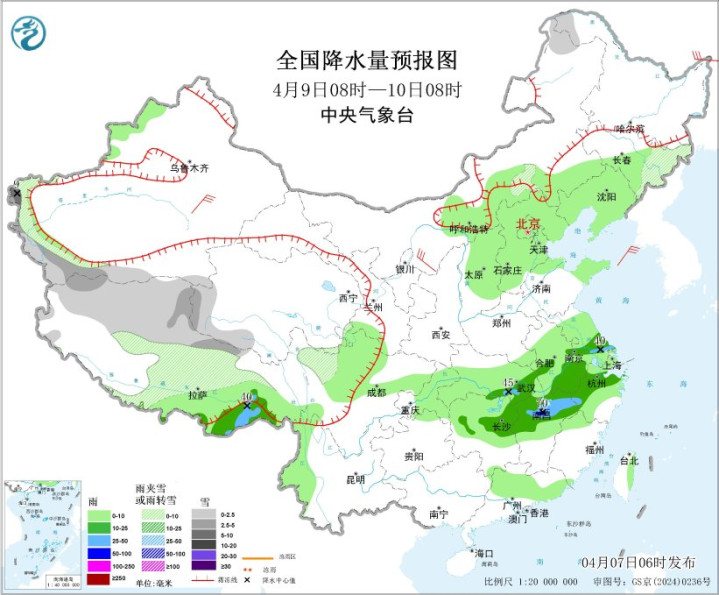 图4天下降水量预告图(4月9日08时-10日08时)