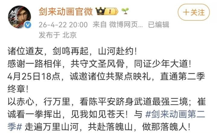 一,剑来第二季将开启超前点映,4月25日纵贯结局