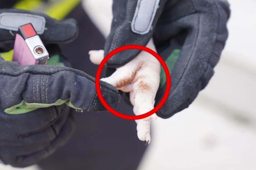实验东谈主员在一只鸡爪上扬弃小鞭炮并点火,“嘭” 的一声,鞭炮短暂炸开,走近搜检发现,原来皎洁的鸡爪已被炸得焦黑。