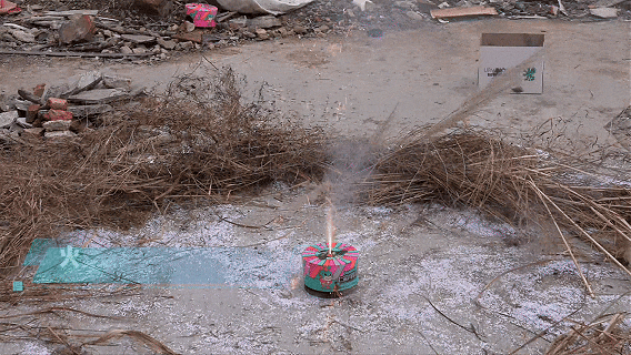 实验东谈主员点火旋转烟花后,火星喷射限制远超预期,周围杂草短暂被引燃。