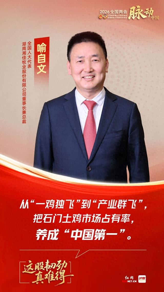 从1992年揣着3000块钱去上海买种鸡,到2003年“非典”时和搭伙东说念主邢卫民一王人守在衍生场,带领衍生户们一步步度过难关,再到2025年全产业链一二三产业产值超90亿元,黄羽肉鸡生鲜禽肉居品阛阓占有率稳居寰宇第一,寰宇东说念主大代表、湖南湘佳牧业股份有限公司董事长兼总裁喻自文的创业故事,正和这只石门金鸡琢磨。